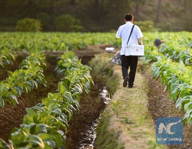 Li Yan is walking through farmland fields to visit a patient. (Xinhua/Hu Chenhuan)