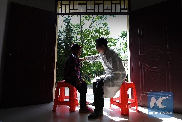 Li Yan is doing physical examination for a local resident. (Xinhua/Hu Chenhuan)