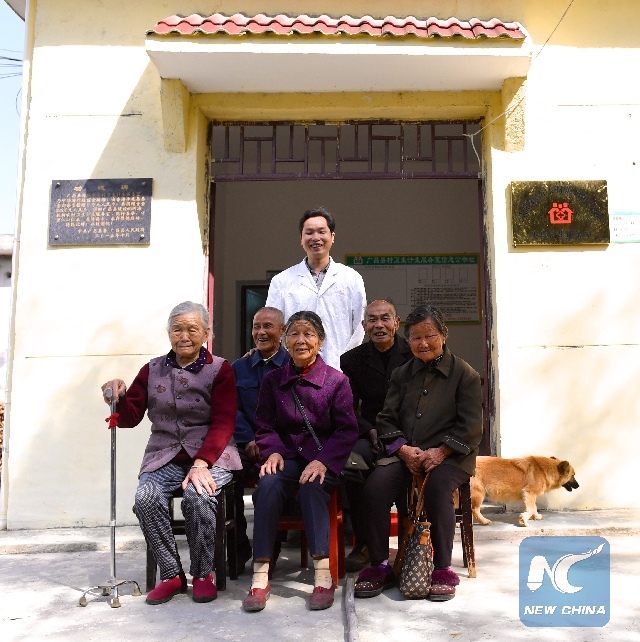 Li Yan and his patients at the local clinic. (Xinhua/Hu Chenhuan)