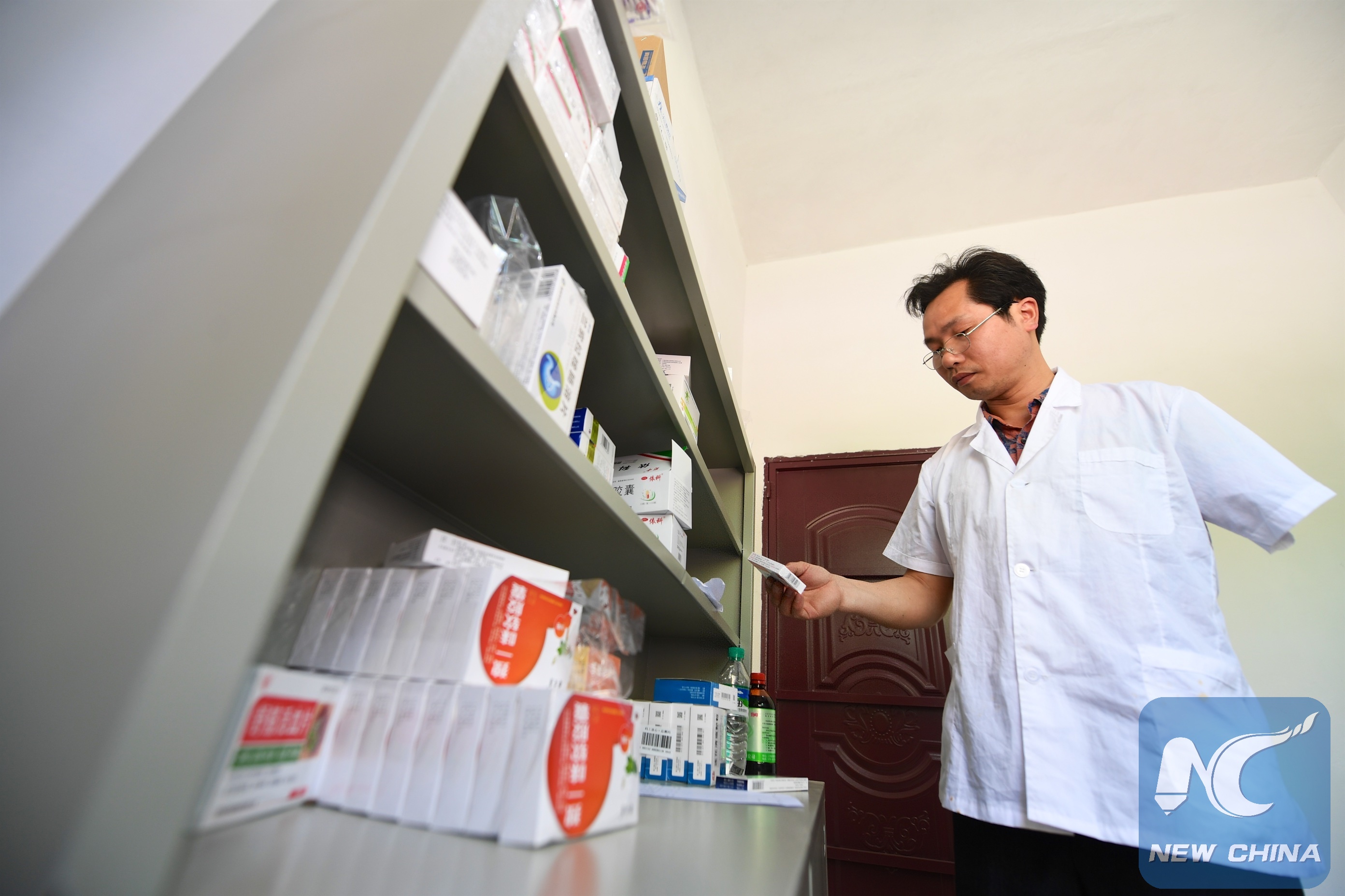 Li Yan is taking medicine for his patient. (Xinhua/Hu Chenhuan)