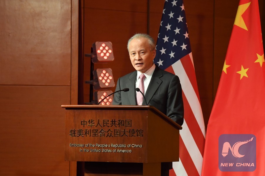 Chinese Ambassador to the United States Cui Tiankai speaks at the Embassy of the People's Republic of China in the United States of America during a Chinese New Year celebration reception in Washington D.C., the United States, on Feb. 13, 2018. (Xinhua File Photo/Yang Chenglin)