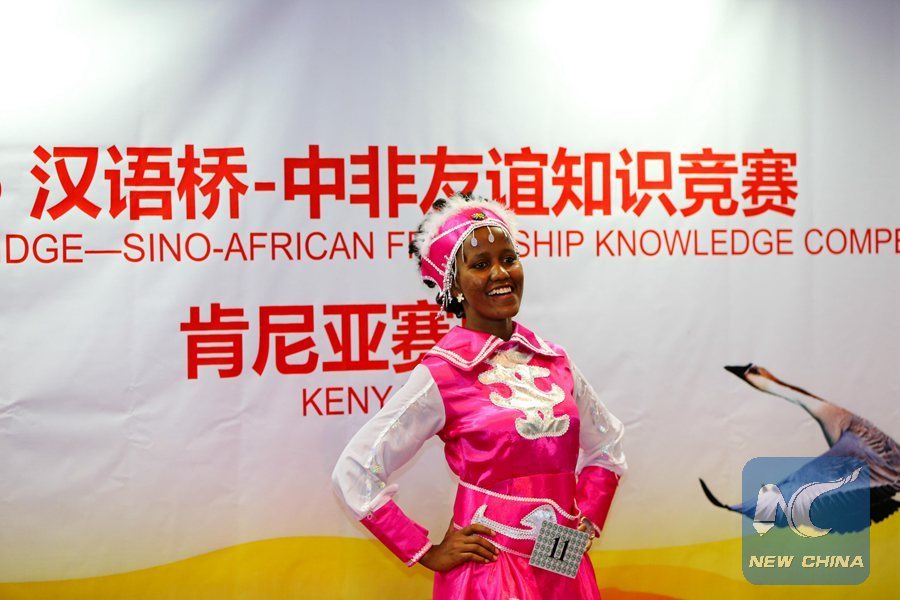 A Kenyan student performs Chinese dance at the Sino-African Friendship Knowledge Competition, in the Confucius Institute at the University of Nairobi, Kenya, on Oct. 14, 2015. (Xihua/Pan Siwei)