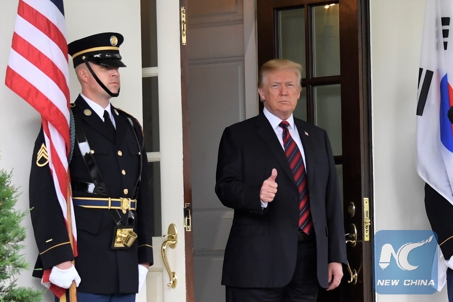 U.S. President Donald Trump (R) waits to meet with visiting President of the Republic of Korea Moon Jae-in (not in the picture) at the White House in Washington D.C., the United States, on May 22, 2018. (Xinhua/Yang Chenglin)