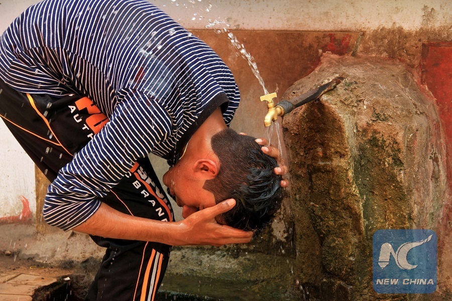 A boy cools himeself off with water during heat wave in southern Pakistani port city of Karachi on May 22, 2018. (Xinhua/Stringer)