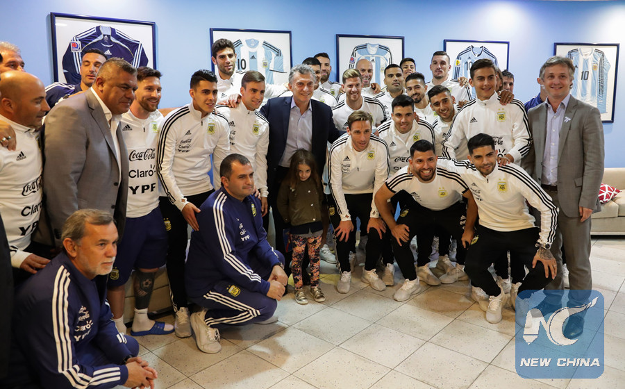 Argentine President Mauricio Macri poses with players and coaching staff before the departure of Argentina's national soccer team for the Russia 2018 FIFA World Cup, in Ezeiza, Argentina, on May 30, 2018. (Xinhua/Argentina's Presidency)