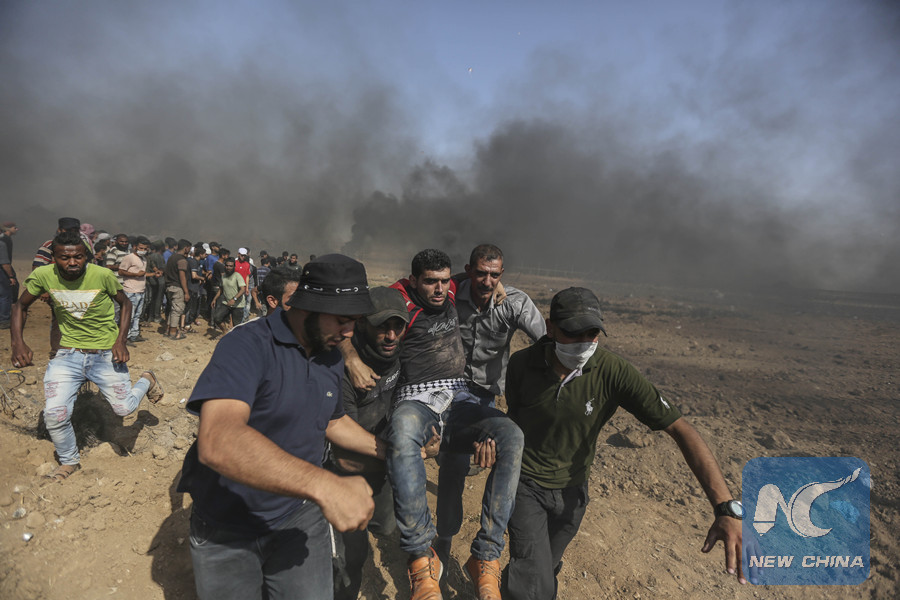 Palestinian protesters carry a wounded man during clashes with Israeli troops, on the Gaza-Israel border, east of Gaza City, on June 8, 2018. (Xinhua/Wissam Nassar)