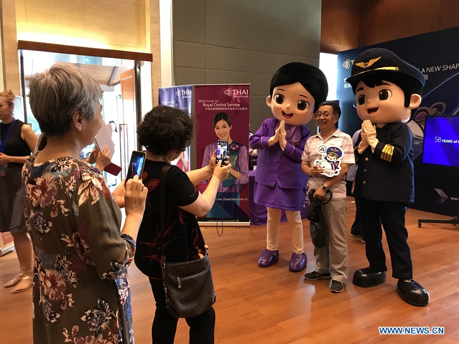 Visitors take photos with staff dressed in costume at the Thai Festival 2018 “Spice up Your Day with Thai Tastes”. The festival was held at the Royal Thai Embassy, Beijing, June 23, 2018. This is the second time that the Thai Festival is organised here as guests can enjoy various activities in the midst of Thai surroundings. (Xinhuanet/Liang Yurou)