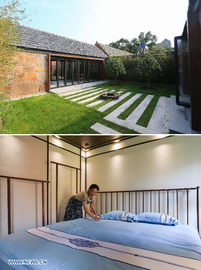 Photo taken on July 5, 2018 shows a homestay (Up) and Zhou Guojing cleaning in a homestay in the Muyun'an community of Rongcheng City, east China's Shandong Province, July 5, 2018. The Muyun'an community is famous for painting and is dedicated to boosting tourism based on cultural heritages. (Xinhua/Wang Nan)