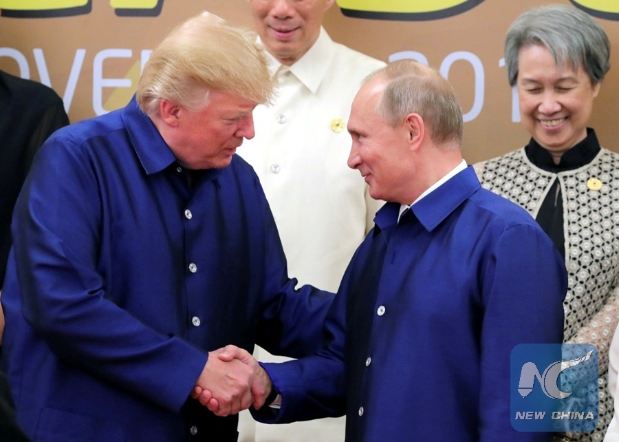 File Photo: U.S. President Donald Trump and Russian President Vladimir Putin shake hands as they take part in a family photo at the APEC summit in Danang, Vietnam, Nov. 10, 2017. (Xinhua/REUTERS)