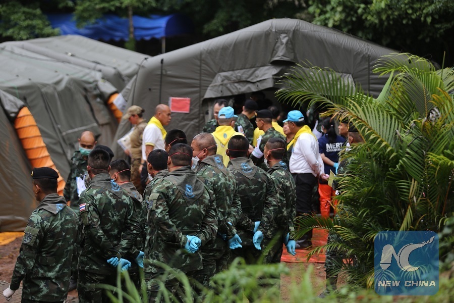 Rescuers work near the cave where 12 young soccer team members and their coach were trapped in Chiang Rai, Thailand, July 8, 2018. (Xinhua/Chiang Rai PR office)
