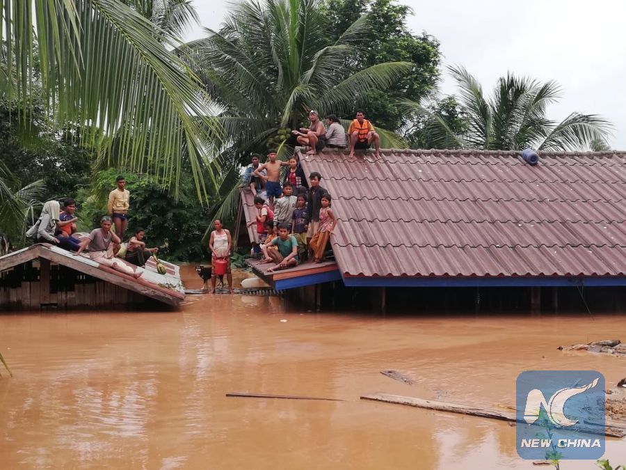Villagers are seen stranded on rooftops of houses after an under-construction dam collapsed in Attapeu, Laos, on July 24, 2018. (Xinhua/Vilaphon Phommasane)