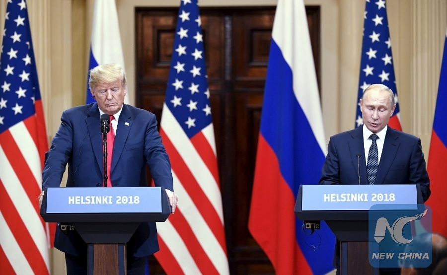U.S. President Donald Trump (L) and Russian President Vladimir Putin attend a joint press conference in Helsinki, Finland, on July 16, 2018. (Xinhua/Lehtikuva/Jussi Nukari)