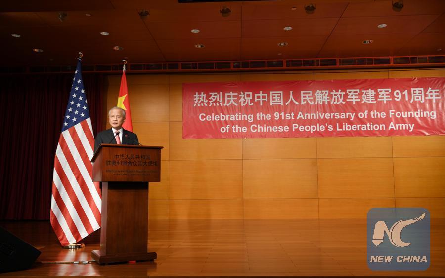 Chinese Ambassador to the United States Cui Tiankai addresses a reception celebrating the 91st anniversary of the founding of the Chinese People's Liberation Army (PLA) in Washington July 30, 2018. (Xinhua/Liu Jie)