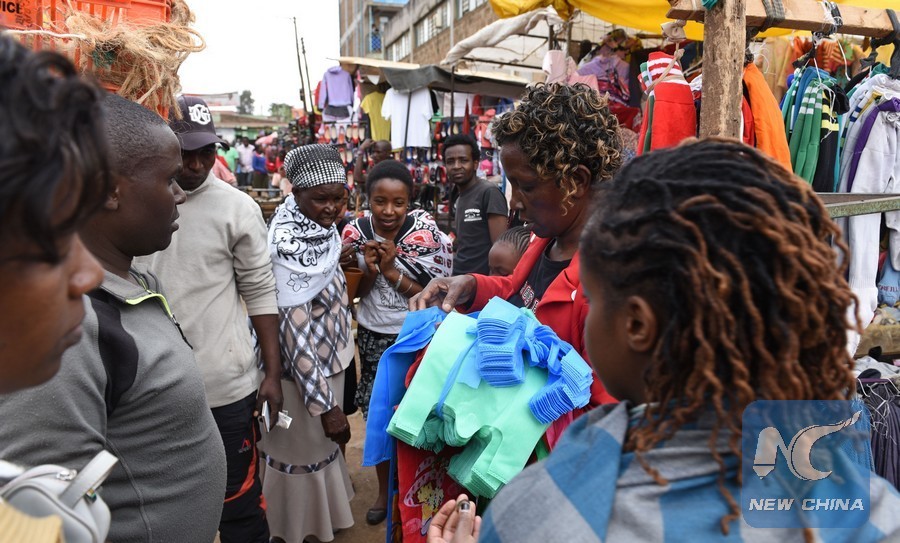 A hawker sells non-woven cloth bags in a market in Nairobi, capital of Kenya, Aug. 28, 2017. (Xinhua/Li Baishuan)