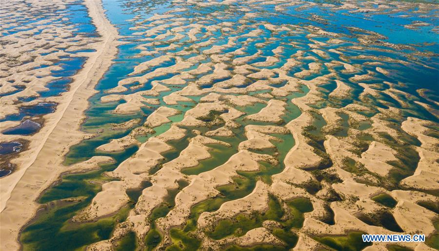 Aerial photo taken on June 9, 2018 shows wetlands formed by water of the Yellow River in flood period at the Kubuqi Desert in Hangjin Banner, north China's Inner Mongolia Autonomous Region. Kubuqi, the seventh largest desert in China, is a good example of China's success in alleviating desertification. About 6,460 square kilometers of the Kubuqi desert has been reclaimed in the last 30 years. (Xinhua/Peng Yuan)