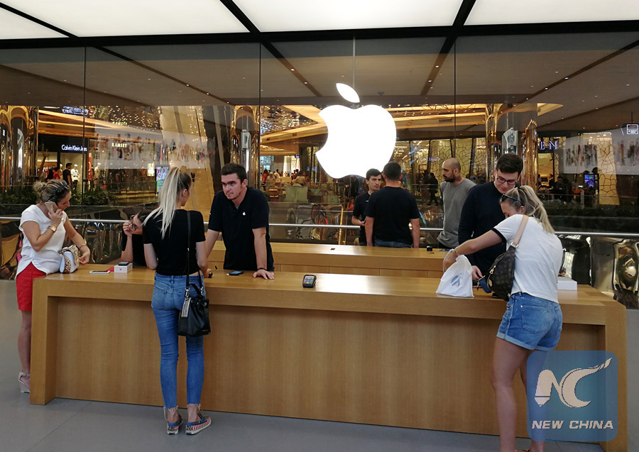Customers talk with staff members at an Apple store in Zorlu Center shopping mall in Istanbul, Turkey, on Aug. 15, 2018. (Xinhua/He Canling)