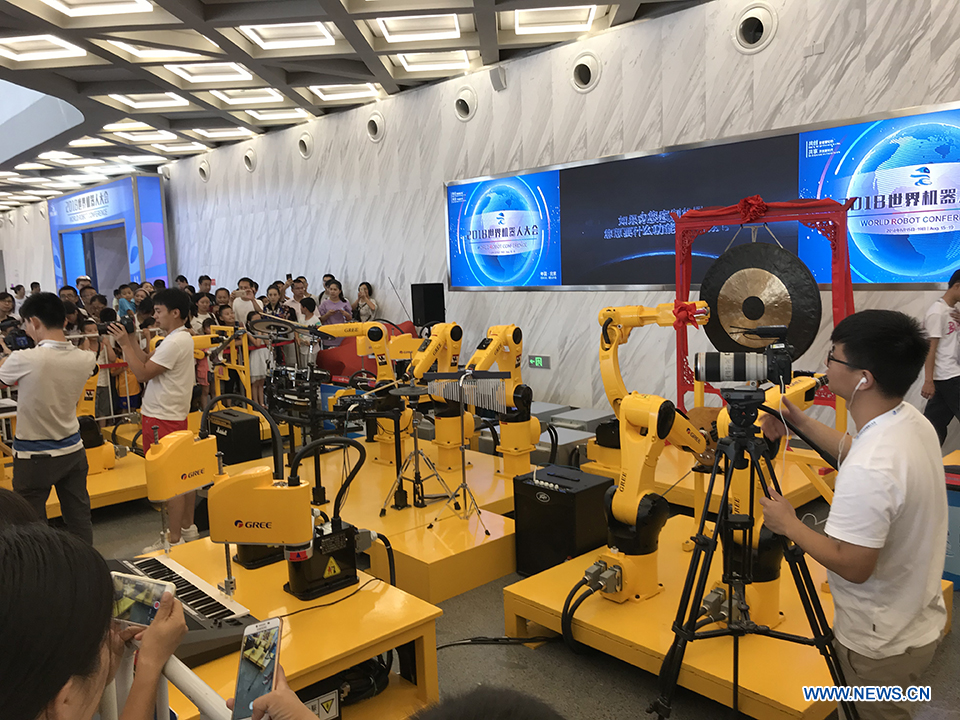 A robot band performs at the 2018 World Robot Conference in Beijing, Aug. 17, 2018. The conference attracts a total of 166 domestic and international enterprises exhibiting their cutting edge technologies and more than 500 items are displayed at the scene. (Xinhuanet/Liang Yurou)