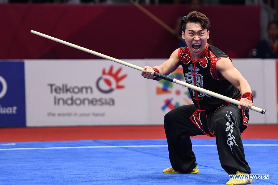 Lee Yongmun of South Korea competes during the Nangun competition of the Men's Nanquan & Nangun All-Round match at the 18th Asian Games in Jakarta, Indonesia, Aug. 21, 2018. (Xinhua/Cheong Kam Ka)