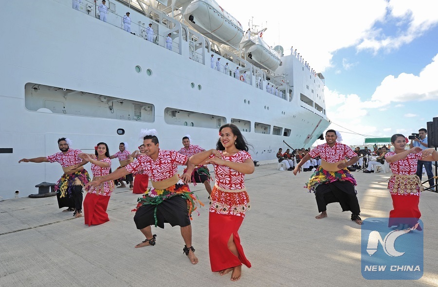 People perform traditional dance to welcome Chinese naval hospital ship Ark Peace in Nukualofa, Tonga, Aug. 13, 2018. (Xinhua/Jiang Shan)