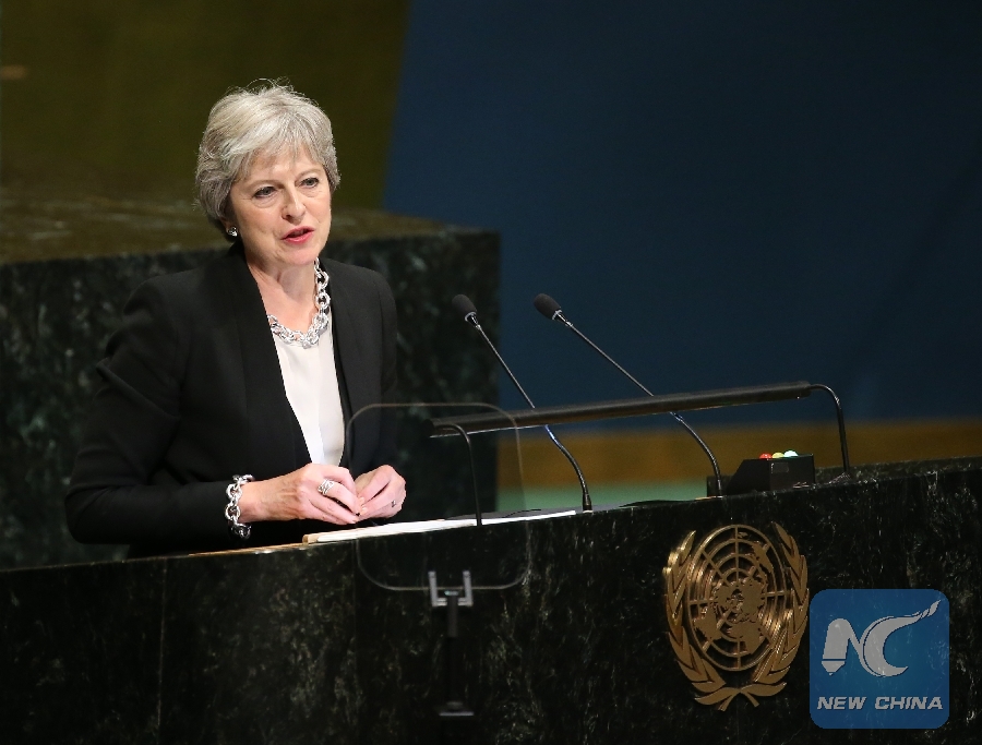 UNITED NATIONS, Sept. 26 (Xinhua) -- British Prime Minister Theresa May on Wednesday called on world leaders to embrace globalization and uphold a rules-based international system which are key to the world development.