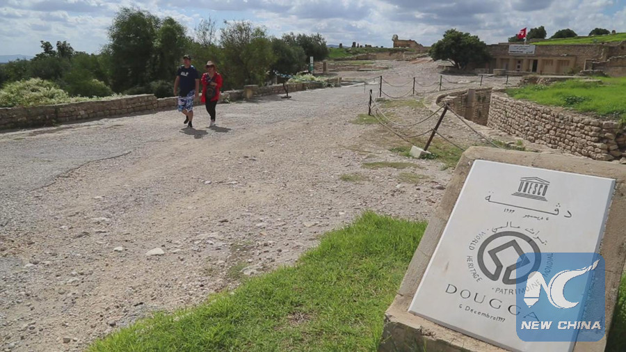 TUNIS, Sept. 29 (Xinhua) -- At an open-air Roman theater in Dougga archeological site, a young Chinese couple was taking part in a special performance testing the acoustic refraction of the architecture.