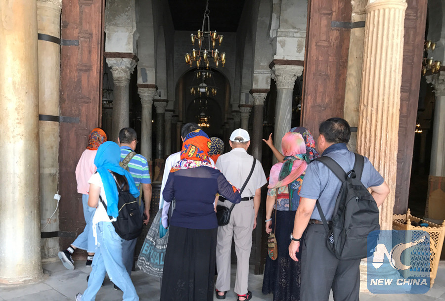 A group of Chinese tourists visit the Great Mosque in Kairouan City in north-central Tunisia on Sept. 25, 2018. (Xinhua photo)