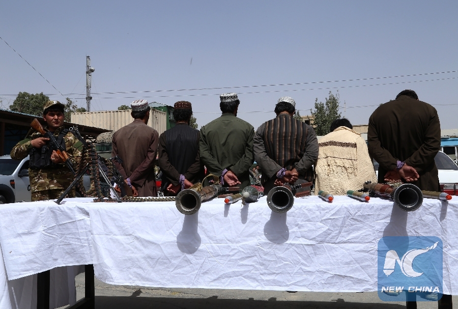 File Photo: Taliban militants stand handcuffed after being captured by Afghan security force members in Ghazni province, Afghanistan, Sept. 1, 2018. (Xinhua/Sayed Mominzadah)