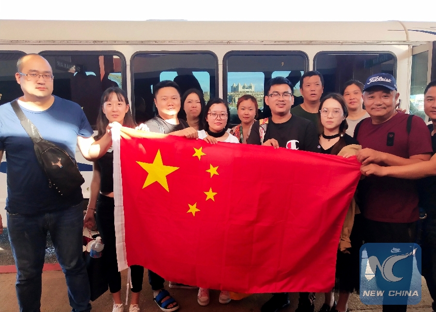 Chinese tourists pose with Chinese national flag before starting to fly back home in Saipan, the Commonwealth of the Northern Mariana Islands (CNMI), Oct. 28, 2018. (Xinhua)