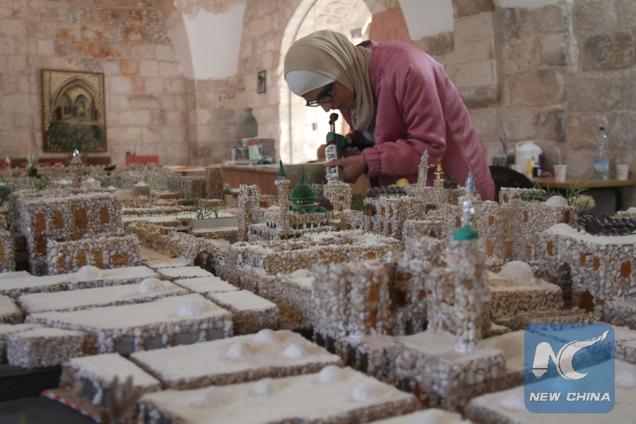 Palestinian artist Noura Jardaneh displays her miniature replica of the old city of Nabllus in the West Bank, on Oct. 29, 2018. (Xinhua/Nidal Eshtayeh)