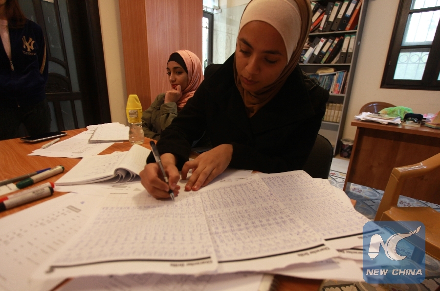 NABLUS, West Bank, Nov. 12 (Xinhua) -- Walking through the narrow alley ways of the old city of Nablus up to an old building now serving as a community center, two young college students were attending a Mandarin Chinese language course.