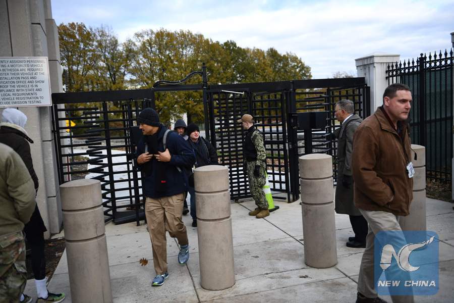 People wait to enter Walter Reed National Military Medical Center in Washington, DC, during an emergency drill on November 27, 2018. (Xinhua/AFP PHOTO)
