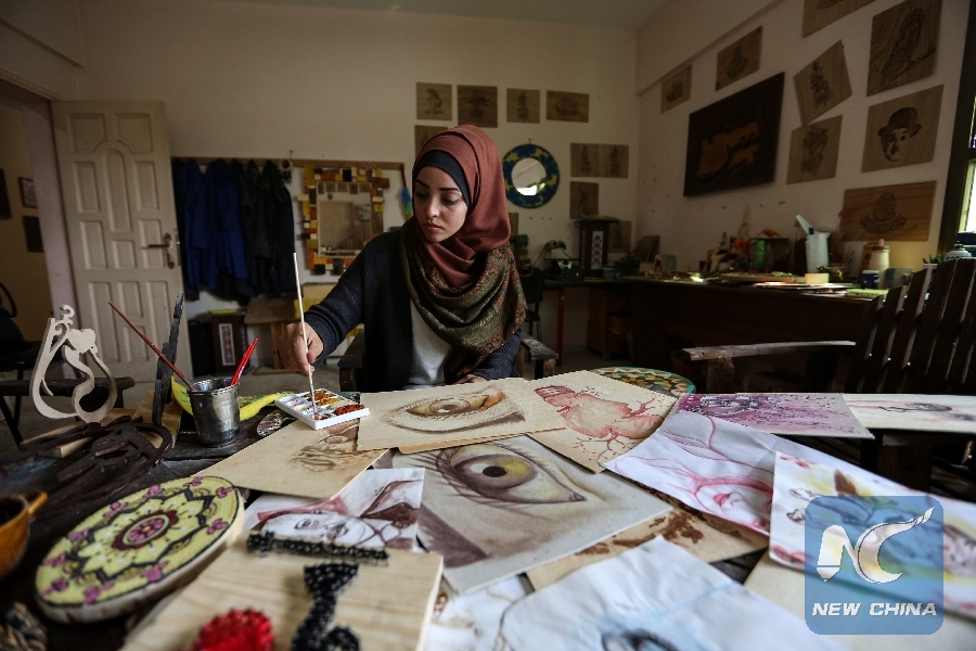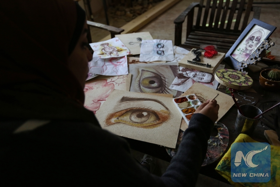 Al-Eish, who lives with her parents and nine brothers in the southern Gaza Strip town of Rafah, told Xinhua she showed drawing talent when she was young and has been working hard on developing her painting skills.