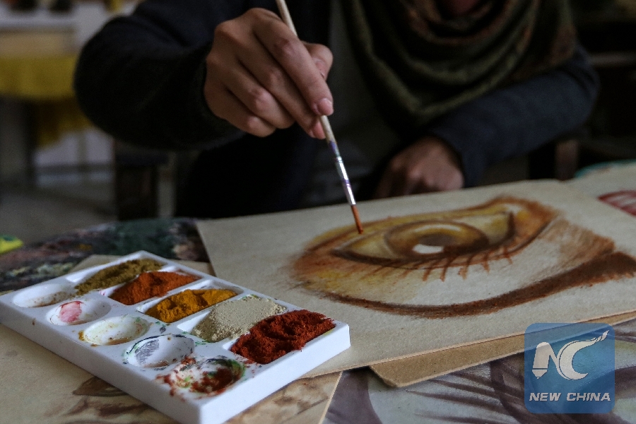 Palestinian artist Walaa Abu al-Eish uses cooking spices to create an alternative painting in the southern Gaza Strip city of Rafah, on Dec. 9, 2018. (Xinhua/Stringer)