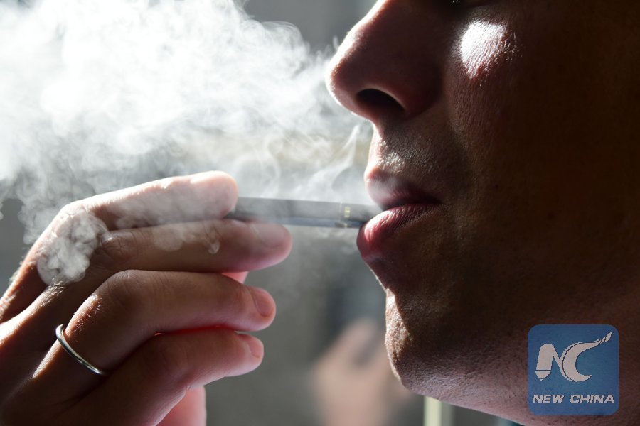 In this file photo taken on October 2, 2018, an illustration shows a man exhaling smoke from an electronic cigarette in Washington, D.C. (Xinhua/ AFP Photo)