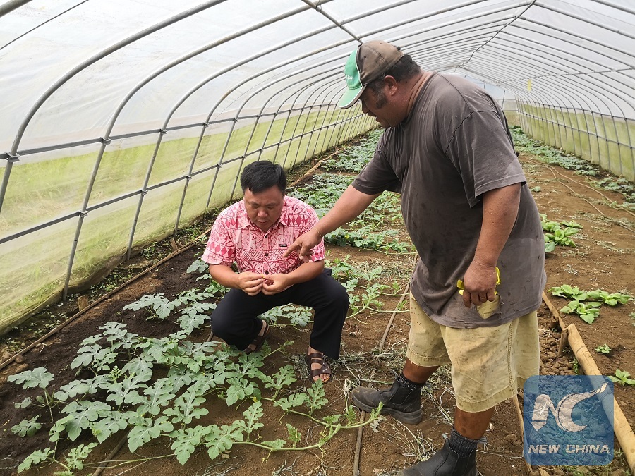 Liu Zhiwen, leader of China-Samoa Agricultural Technical Aid Project (Left) and John Maposua, a pilot demonstration farmer from the Aleasa village in Apia, discuss watermelon planting techniques in the farmer's tunnel house. (Xinhua/Zhang Yongxing)