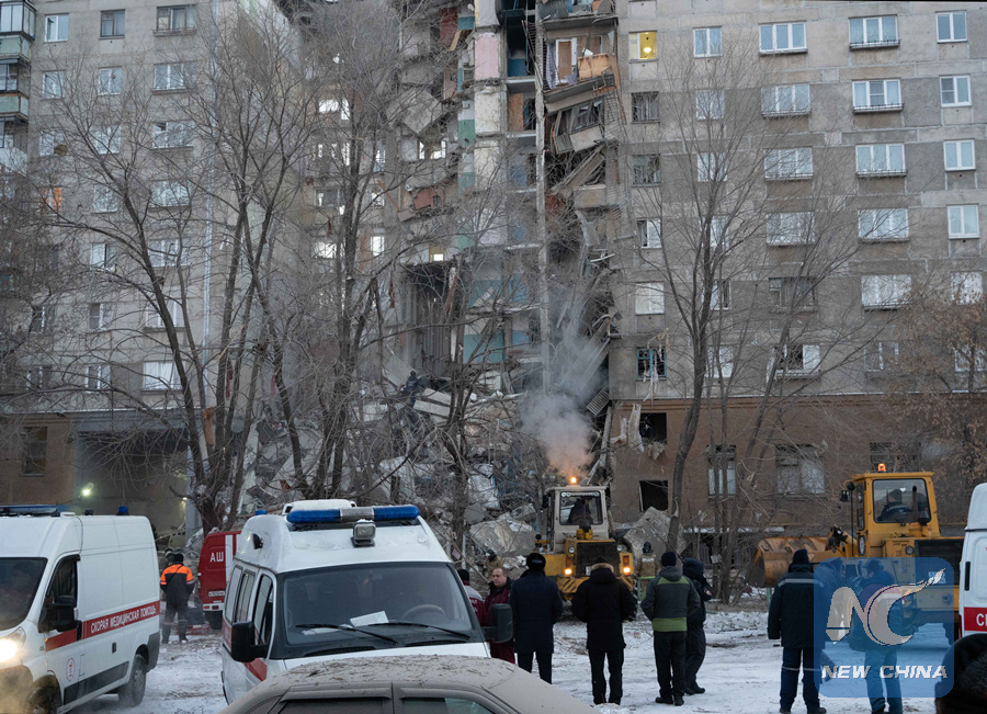 A residential building is seen partially destroyed after a gas explosion in the industrial city of Magnitogorsk, Russia, Dec.31, 2018. (Xinhua/Sputnik)