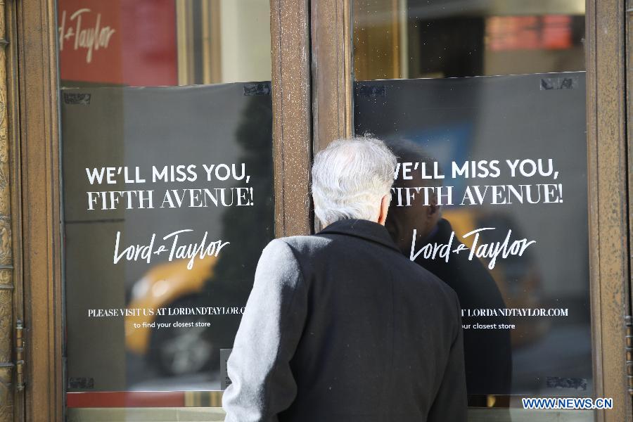 A man tries to look through closed doors of Lord & Taylor flagship store on Fifth avenue in Manhattan, New York City, the United States, on Jan. 3, 2019. The famous department store chain Lord & Taylor officially closed its flagship store on Fifth avenue in Manhattan. The 11-storey building was a landmark on New York's most prestigious shopping area for over a century, boasting about its animated holiday windows and fine selection of jewelries and clothing and attracting city dwellers and tourists alike. (Xinhua/Wang Ying)