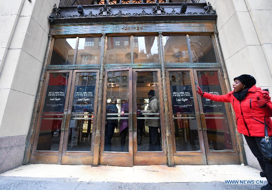 A woman closes a door of Lord & Taylor flagship store on Fifth avenue in Manhattan, New York City, the United States, on Jan. 2, 2019. The famous department store chain Lord & Taylor officially closed its flagship store on Fifth avenue in Manhattan. The 11-storey building was a landmark on New York's most prestigious shopping area for over a century, boasting about its animated holiday windows and fine selection of jewelries and clothing and attracting city dwellers and tourists alike. (Xinhua/Li Rui)