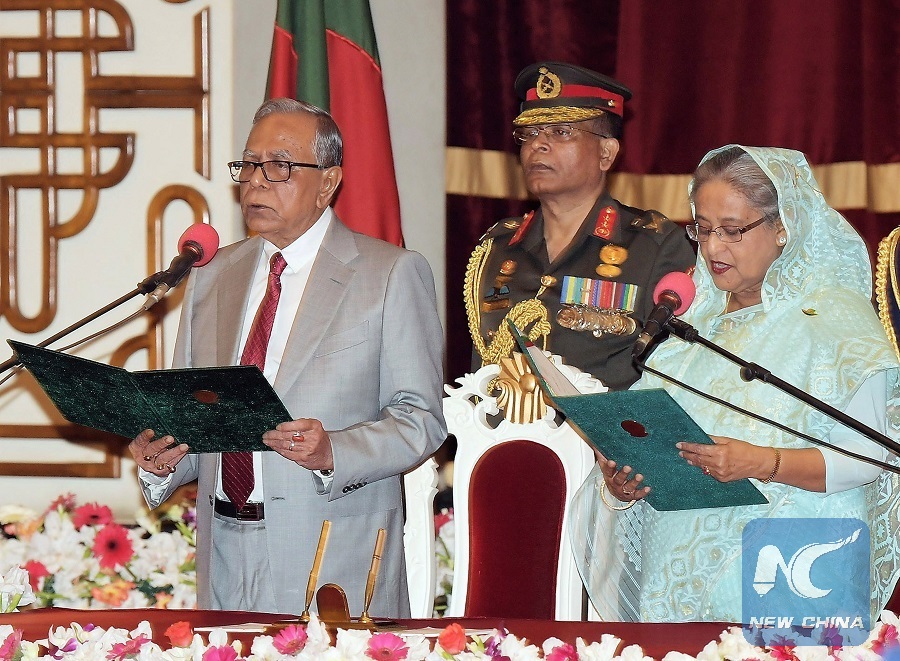 Sheikh Hasina (R) takes oath during swearing-in ceremony in Dhaka, capital of Bangladesh, Jan. 7, 2019. (Xinhua/Naim-ul-karim)