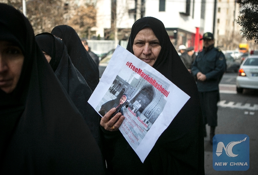 Women gather outside the Swiss embassy in Tehran, Iran, on Jan. 20, 2019 to protest the U.S. detention of the Press TV journalist and news presenter, Marzieh Hashemi. (Xinhua/Ahmad Halabisaz)