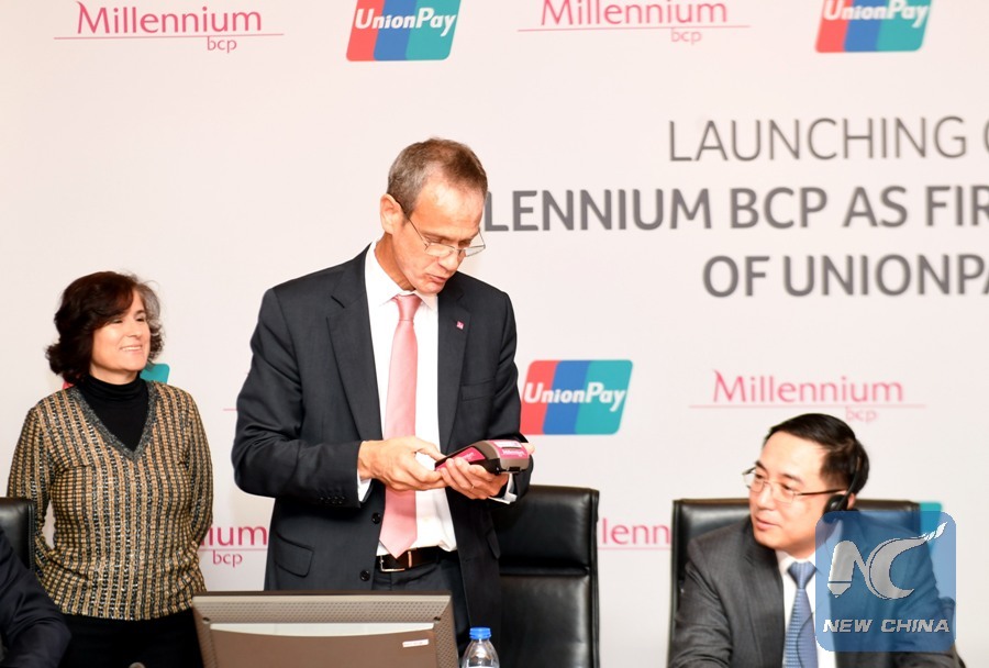 Millennium bcp CEO Miguel Maya (C) makes the first payment transaction show on the spot during the launching ceremony for the issuance of the UnionPay card of Millennium bcp in Lisbon, Portugal, on Jan. 25, 2019. China's UnionPay and Portuguese bank Millennium bcp held a launching ceremony here Friday for the issuance of the UnionPay card of Millennium bcp. (Xinhua/Zhang Liyun)