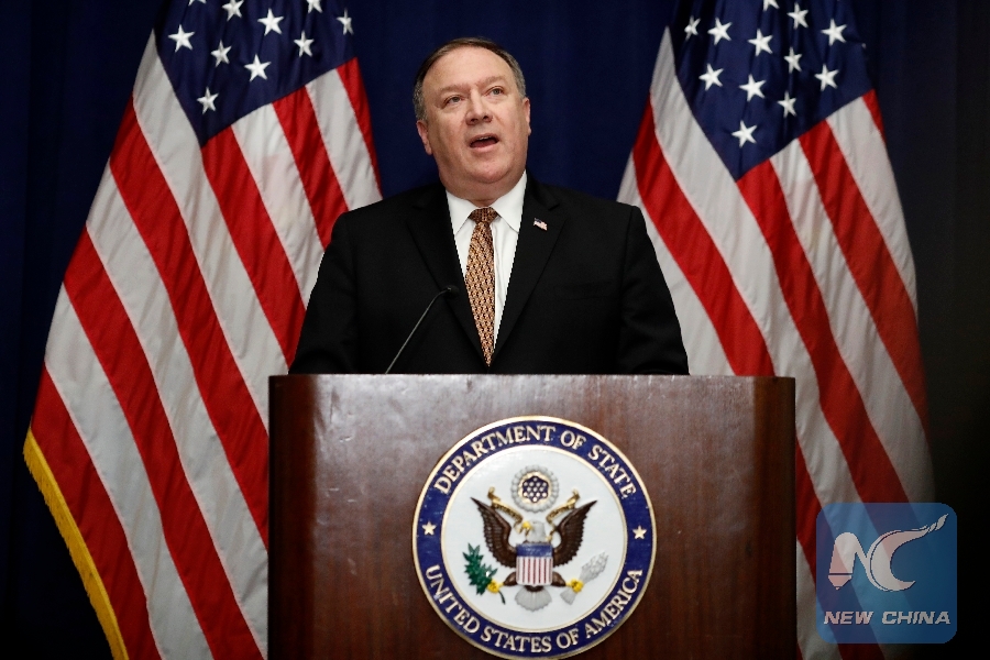 File Photo: U.S. Secretary of State Mike Pompeo speaks at a press briefing in New York, the United States, May 31, 2018. (Xinhua/Li Muzi)
