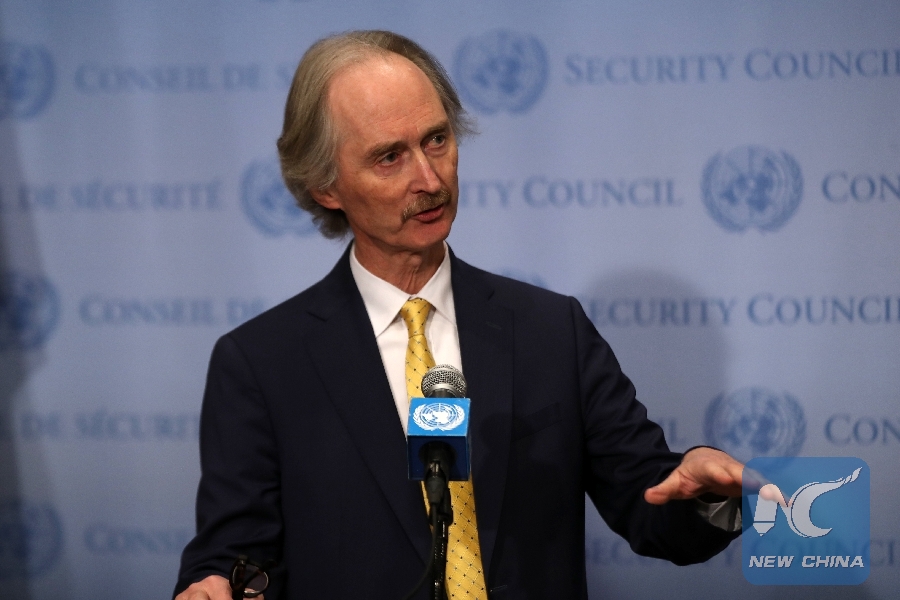 File Photo: Geir Pedersen, special envoy of UN Secretary-General for Syria, speaks to journalists during a press encounter after a Security Council meeting on the political situation in Syria at the UN headquarters in New York, Feb. 28, 2019. (Xinhua/Li Muzi)