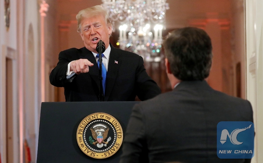 File Photo: U.S. President Donald Trump points at CNN's Jim Acosta and accuses him of "fake news" while taking questions during a news conference at the White House in Washington, U.S., Nov. 7, 2018. (Xinhua/REUTERS)