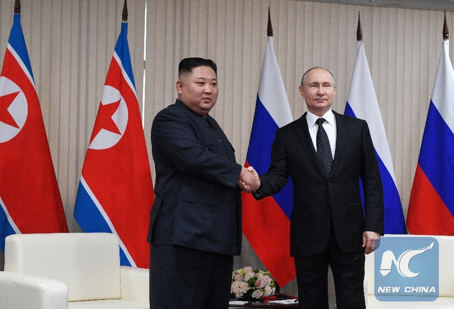 Russian President Vladimir Putin (R) shakes hands with top leader of the Democratic People's Republic of Korea (DPRK) Kim Jong Un in Vladivostok, Russia, April 25, 2019. (Xinhua/Sputnik)