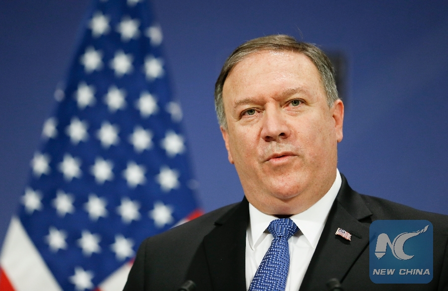 File Photo: U.S. Secretary of State Mike Pompeo addresses a press conference after NATO foreign ministers' meeting at its headquarters in Brussels, Belgium, on April 27, 2018. (Xinhua/Ye Pingfan)