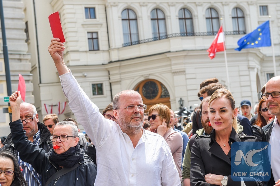 People gather in front of Ballhausplatz to call for a snap election in Vienna, Austria, May 18, 2019. (Xinhua/Guo Chen)