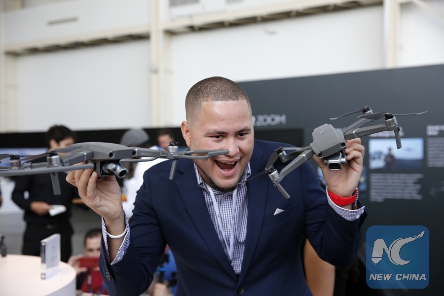 A man poses with the newly-released DJI Mavic 2 Pro (R) and Mavic 2 Zoom drones during the launching ceremony in New York, the United States, Aug. 23, 2018. (Xinhua/Li Muzi)