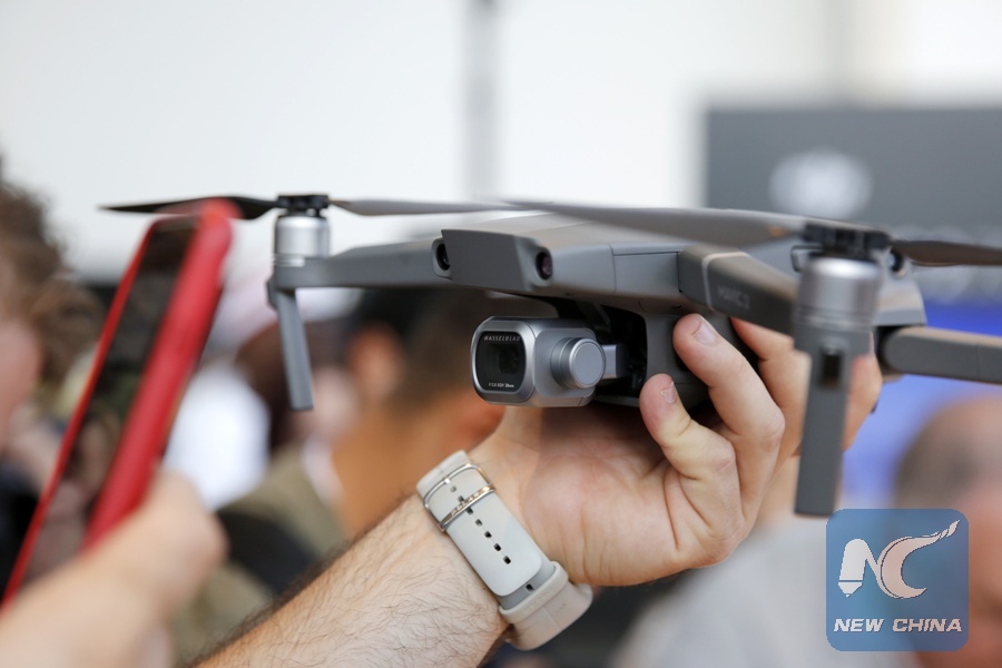 Photo taken on Aug. 23, 2018 shows the newly-released DJI Mavic 2 Pro drone during the launching ceremony in New York, the United States. (Xinhua/Li Muzi)