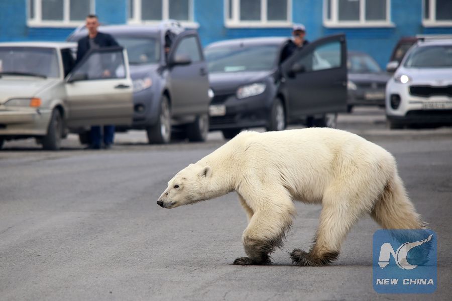 A stray polar bear walks on a road on the outskirts of the Russian industrial city of Norilsk on June 17, 2019. - A hungry polar bear has been spotted on the outskirts of Norilsk, hundreds of miles from its natural habitat, authorities said on June 18, 2019. (Photo by Irina Yarinskaya/Zapolyarnaya pravda newspaper/AFP)